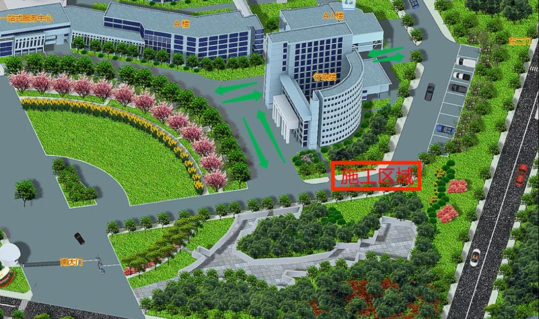 因校内部分雨污水管改造,自2021年10月1日(星期五)—10月4日(星期一)需对宝山校区行政楼南侧部分路段进行封闭施工(图示施工区域为封闭路段),请过往人员从行政楼西侧以及行政楼北侧通行(图示箭头区域),过往车辆注意绕行,以保证安全。