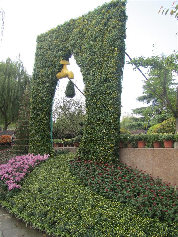 用小菊种成一块高5.5米、宽3.9米的的底板,中间漏空挂上金色水龙头,龙头下方是用小菊种成的水滴。水滴滴下汇流成用菊花色块摆放成的河流。不积跬步,无以致千里,景点象征着上大人以坚忍不拔的性格默默耕耘,终将积微成著,百川汇海。