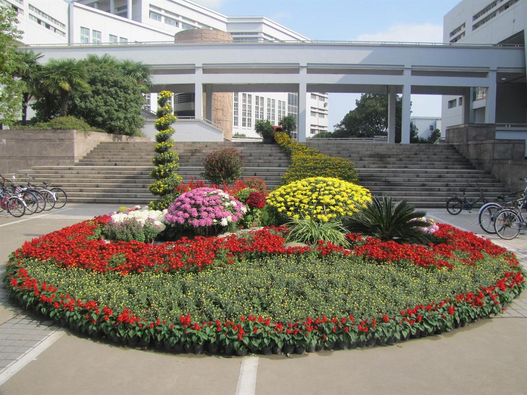 上千盆黄色小菊从台阶上的花瓶中倾泻而下,撒下瀑布状花束,最后汇聚在楼间广场。景点意欲营造出“廊下阶前一片金,香声潮浪涌游人”的意境。那如瀑布般撒下的花束象征着知识如海水般从教学楼中溢出,蔓延到整个校园。经知识滋养的上大莘莘学子们必定学有所有,绽放光芒。本景点用菊3000余盆。