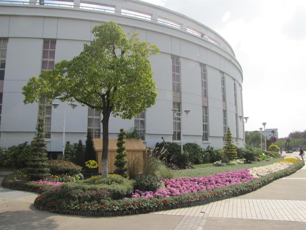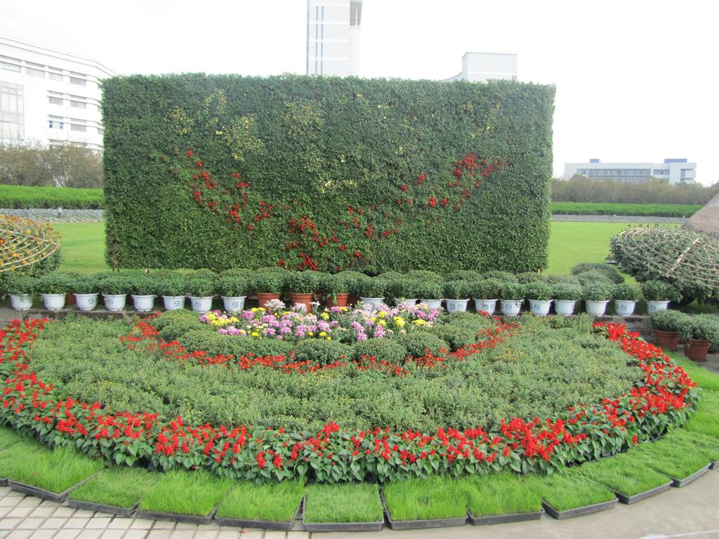 用红草扦插出“菊花吐艳多姿彩,装扮校园更美丽”十四个长1米宽0.8米的大字,嵌在以4000盆黄小菊打造的长21米、高3米的背景墙上。主体景点旁配置黄、红、粉等各色小菊3000余盆加以点缀,精品菊展区50多个品种100多盆品种菊争相吐艳,供人欣赏。菊花展举办十一载,年年菊香满园、流光溢彩,装扮校园,给上大人和参观者以美的享受、艺术的熏陶。