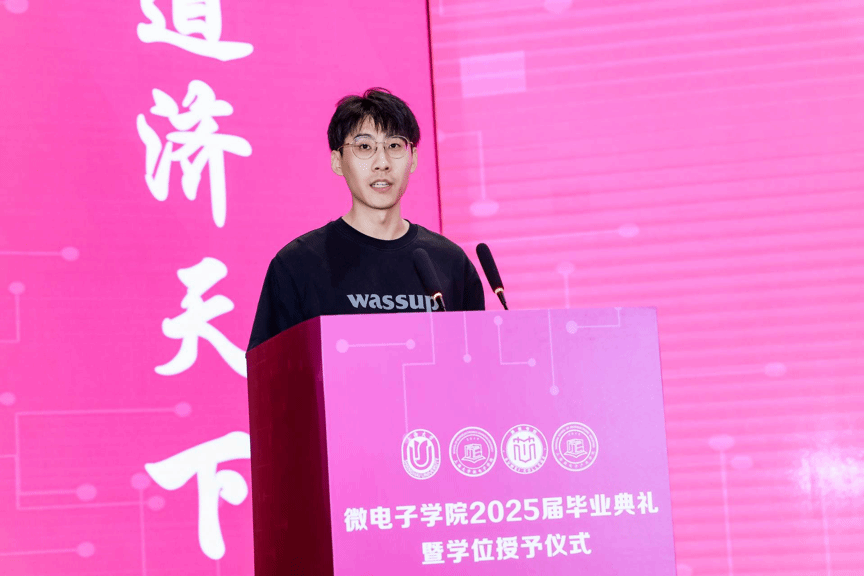 毕业生代表校长奖学金特等奖获得者张岩同学深情回顾了四年求学时光,感恩学院的培养和师长的教诲。他表示将带着校训精神投身“中国芯”事业,在科技报国中践行微电子人的使命。